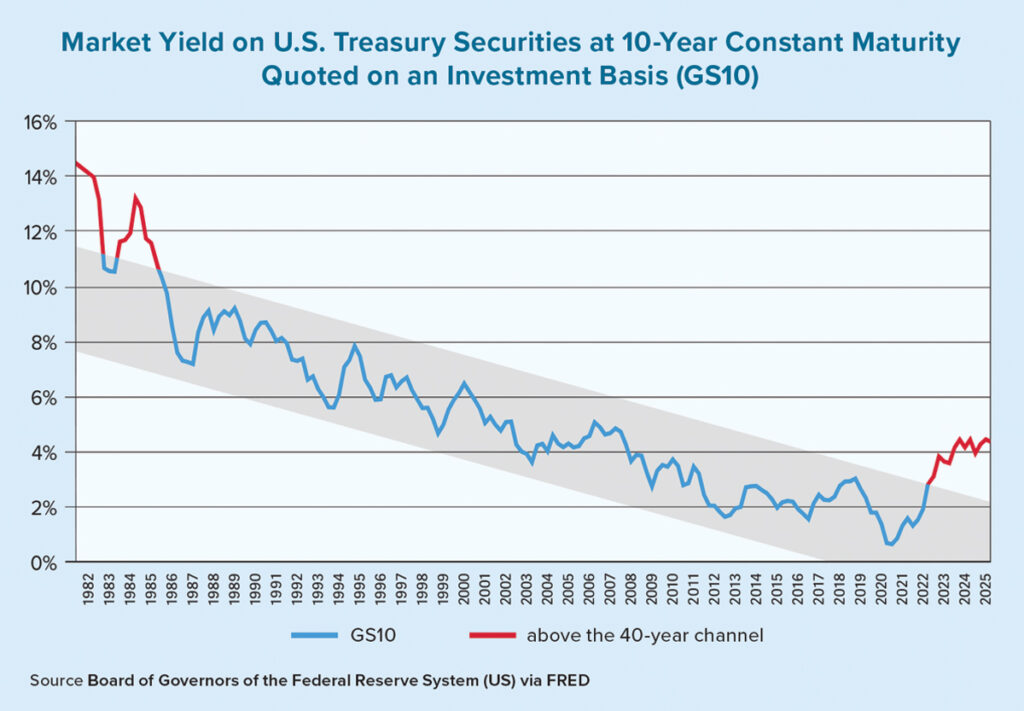 For decades, analysts have charted long-term 10-year Treasury yields through a channel some call the “chart of truth.” It followed the reasoning that financial markets are generally cyclical. Every time bond yields approached the top, they’d council, “Don’t worry, this is where you should buy the long bond. If it’s hitting the upper boundary, it’ll fall back.” These were reliable buying opportunities.