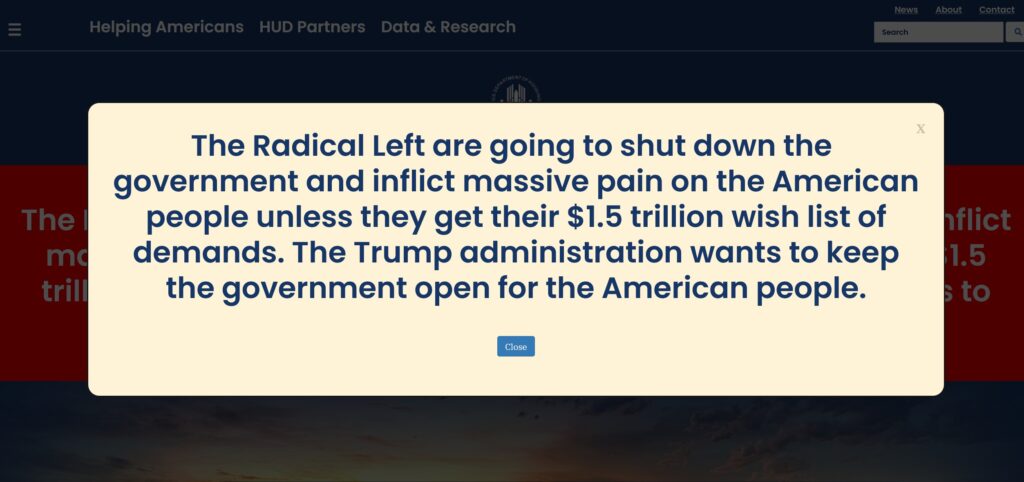 Closing the initial pop-up alert on HUD’s website, one is confronted with a second political warning: