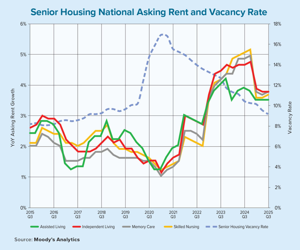 Vacancy rates across four senior housing care types — including independent living, assisted living, memory care and skilled nursing — have consistently declined, with memory care experiencing the largest drop of 80 basis points in the third quarter of 2025. Rent growth remains robust, ranging from 3.6% to 3.8% year over year across subsectors, though signs of a slowdown in rent growth are emerging due to affordability challenges.