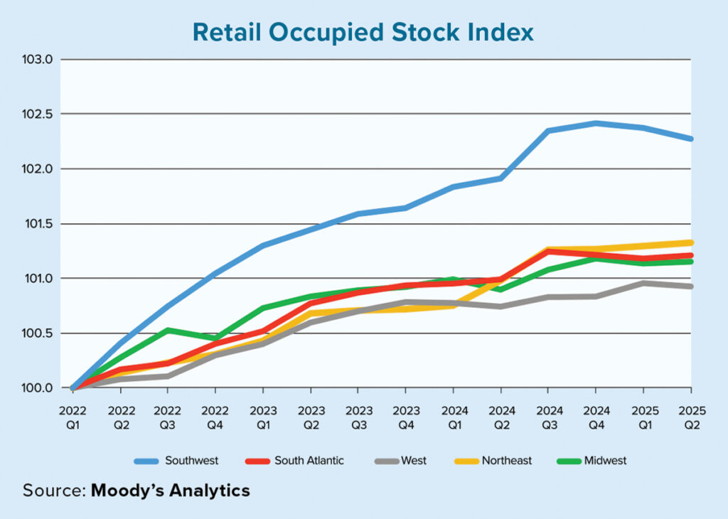 Moody’s Analytics’ real estate update for August reports year-to-date neighborhood and community center rent growth of only 0.4%, with the majority occurring in the first three months of 2025. The data on occupancy growth shows a similar trend, with national occupied stock rising just 1.2 million square feet, or 0.06%.