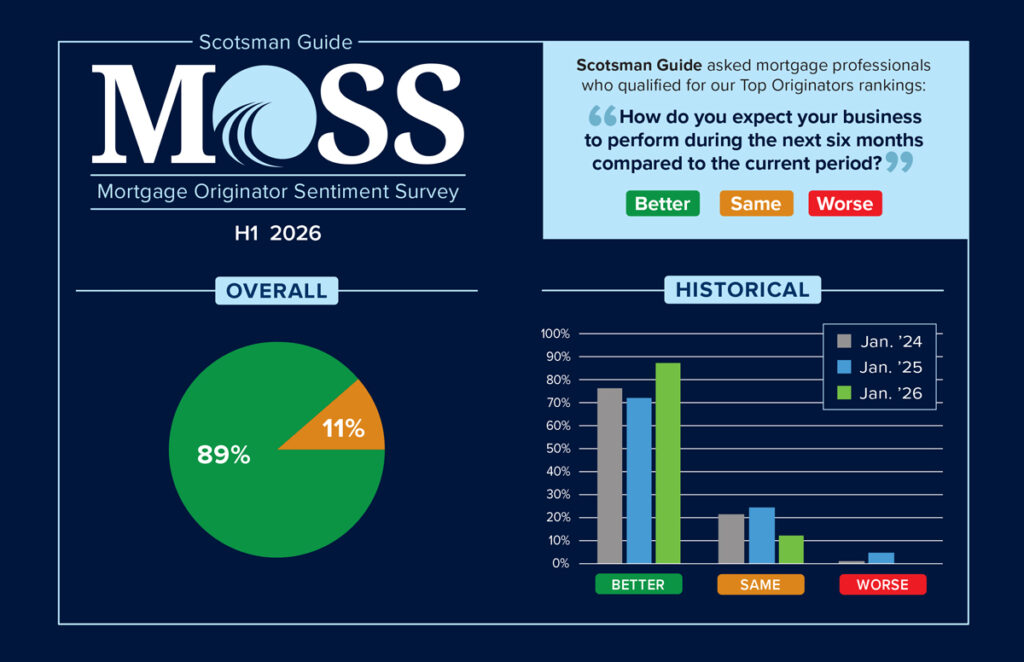 Though mortgage originators see challenges ahead, they were overwhelmingly optimistic at the start of 2026, based on feedback given in January to Scotsman Guide’s Mortgage Originator Sentiment Survey (MOSS).